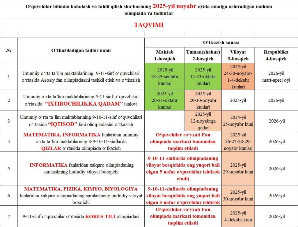 Umumtaʼlim maktablari o‘quvchilari o‘rtasida sentabr-dekabr oylarida o‘tkaziladigan olimpiadalar bilan tanishib oling.