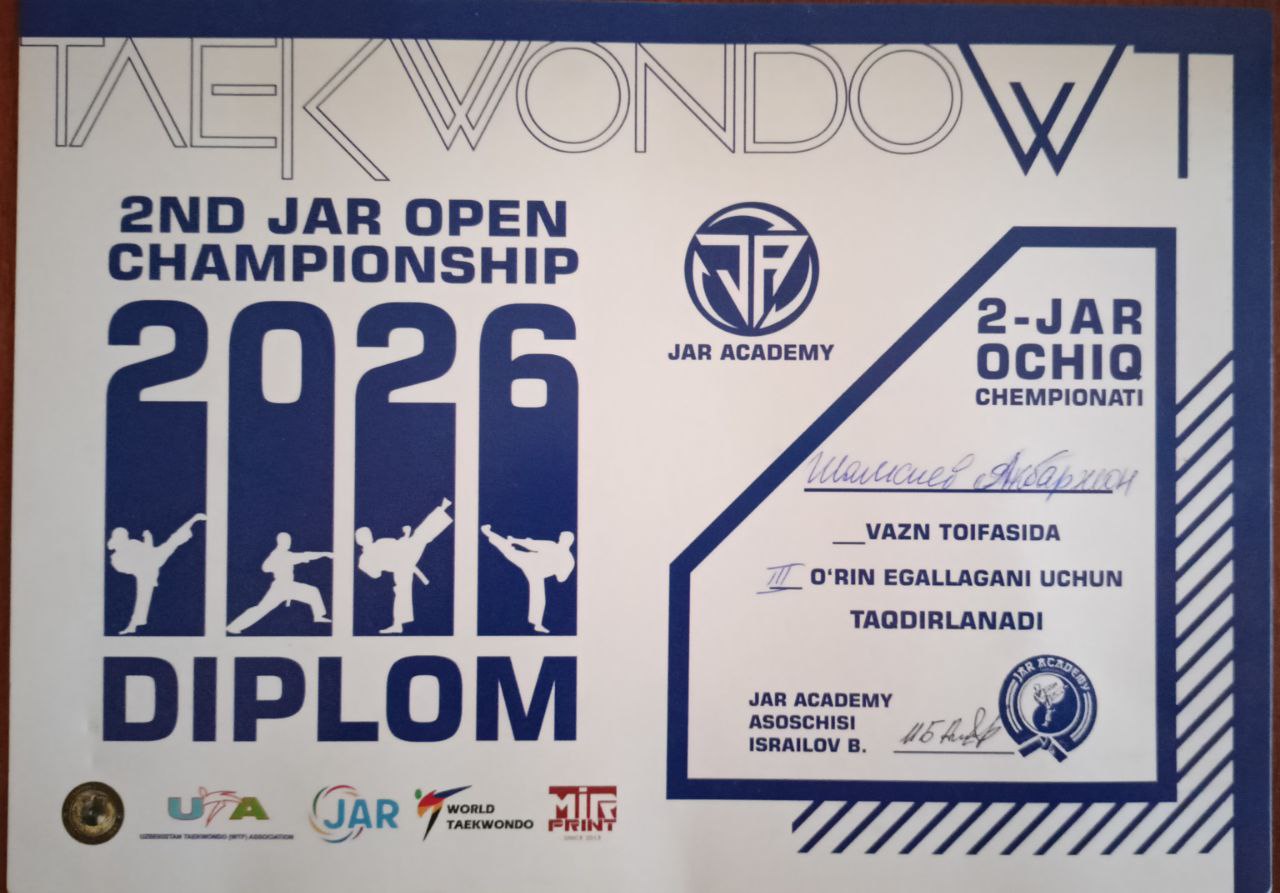 Bulung’ur tumani maktabgacha va maktab ta’limi bo‘limiga qarashli 42-umumiy o’rta taʼlim maktabining o’quvchisi Shamshiyev Akbarjon 28 kg vazn toifasida Toshkent shahrida TAEKWONDO sport turidan o’tkazilgan 2-JAR ochiq chempionati musobaqasida faxrli 3-o’rinni egalladi.